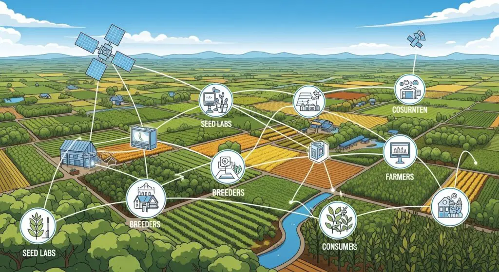 Open, interoperable platforms integrate seed genetics with IoT sensors, satellite imagery, CRM systems and supply‑chain analytics. Generative AI tools optimize seed selection and planting strategies, boosting yields by 25 %. AI‑based advisory systems deliver real‑time recommendations on variety selection, sowing dates and input applications. Data commons built on blockchain allow growers, breeders, researchers and buyers to share performance data, carbon metrics and traceability records. These networks enable collaborative breeding programs, regenerative finance and climate‑smart supply chains.